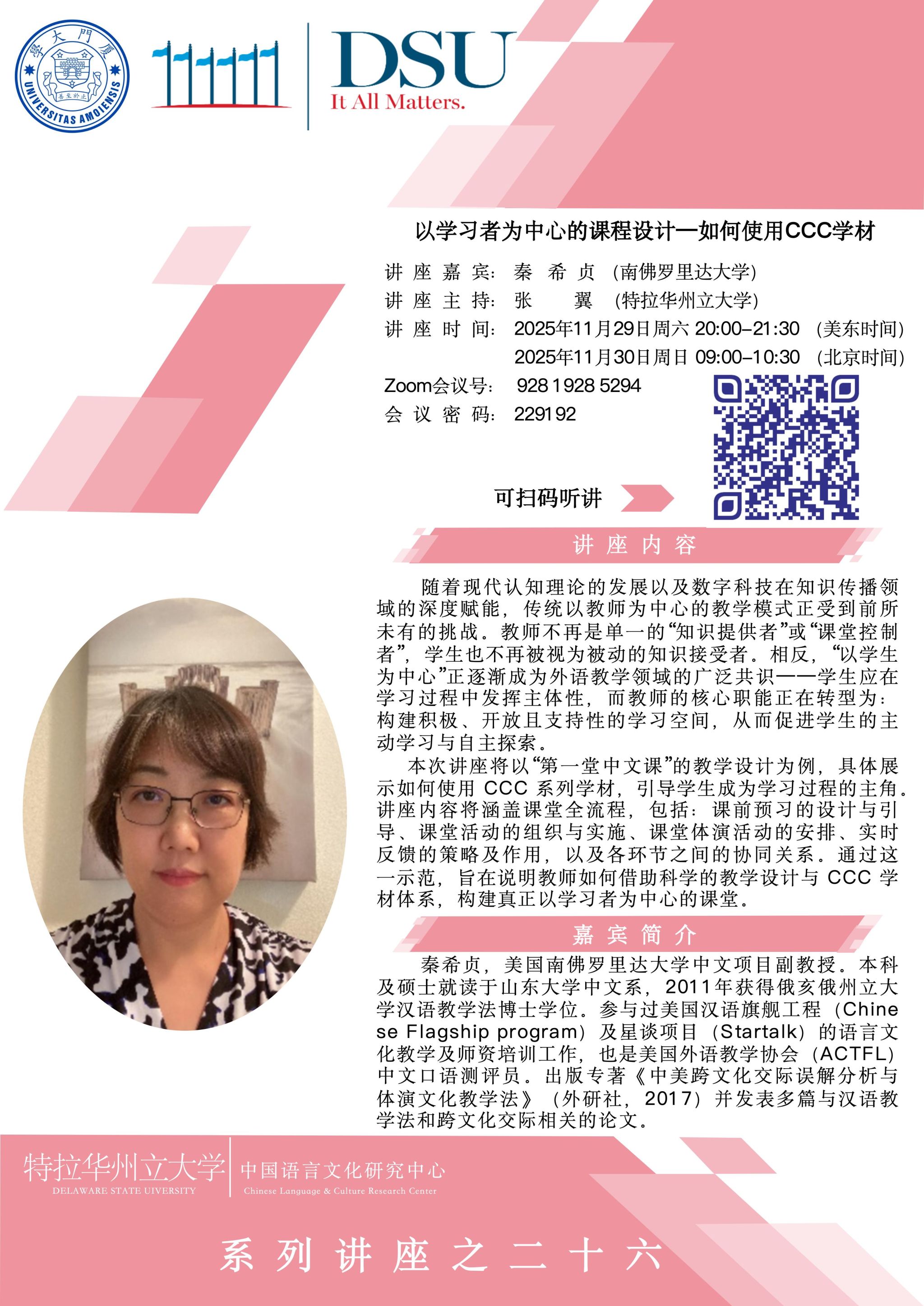 当地时间11月29日,美国特拉华州立大学中国语言文化研究中心(以下简称“中心”)系列学术讲座第二十六期顺利举办。本次讲座由南佛罗里达大学秦希贞副教授主讲,主题为《以学习者为中心的课程设计——如何使用 CCC 学材》;讲座以线上形式开展,由中心主任张翼副教授主持。尽管讲座时间恰逢美国感恩节假期,仍吸引了中美两国及东南亚地区的 100 多位国际中文教育工作者在线聆听