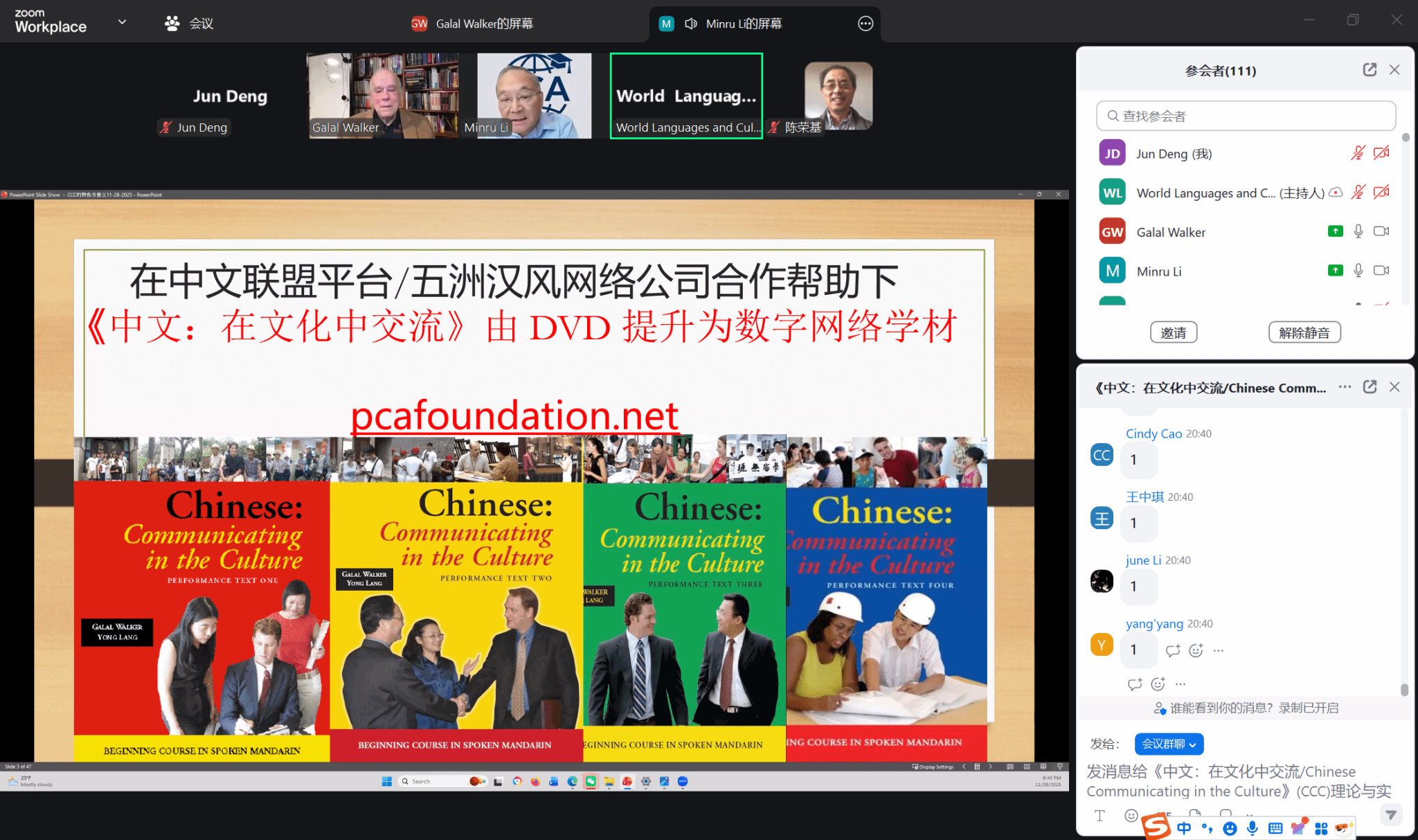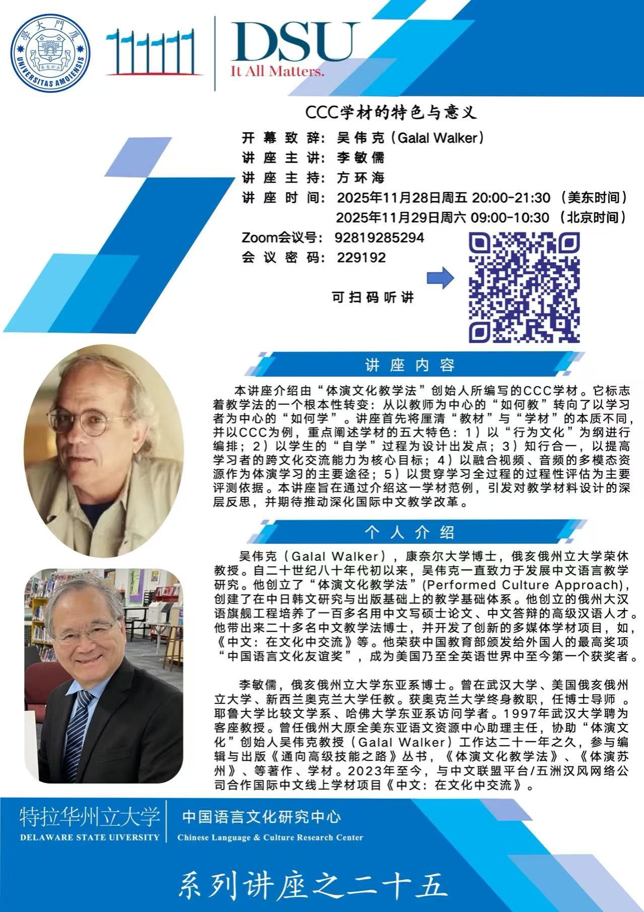 当地时间11月28日,美国特拉华州立大学中国语言文化研究中心(以下简称“中心”)系列学术讲座第二十五期顺利举办。此次讲座由俄亥俄州立大学荣休教授吴伟克(Galal Walker)与李敏儒教授联袂主讲,讲座主题为《CCC学材的特色与意义》。讲座以线上形式开展,由中心主任方环海教授主持。尽管讲座时间恰逢美东感恩节假期晚间、北京时间周六早晨,仍吸引了中美两国国际中文教育界众多研究者与学习者踊跃参与,线上参会人数逾 110 人。
