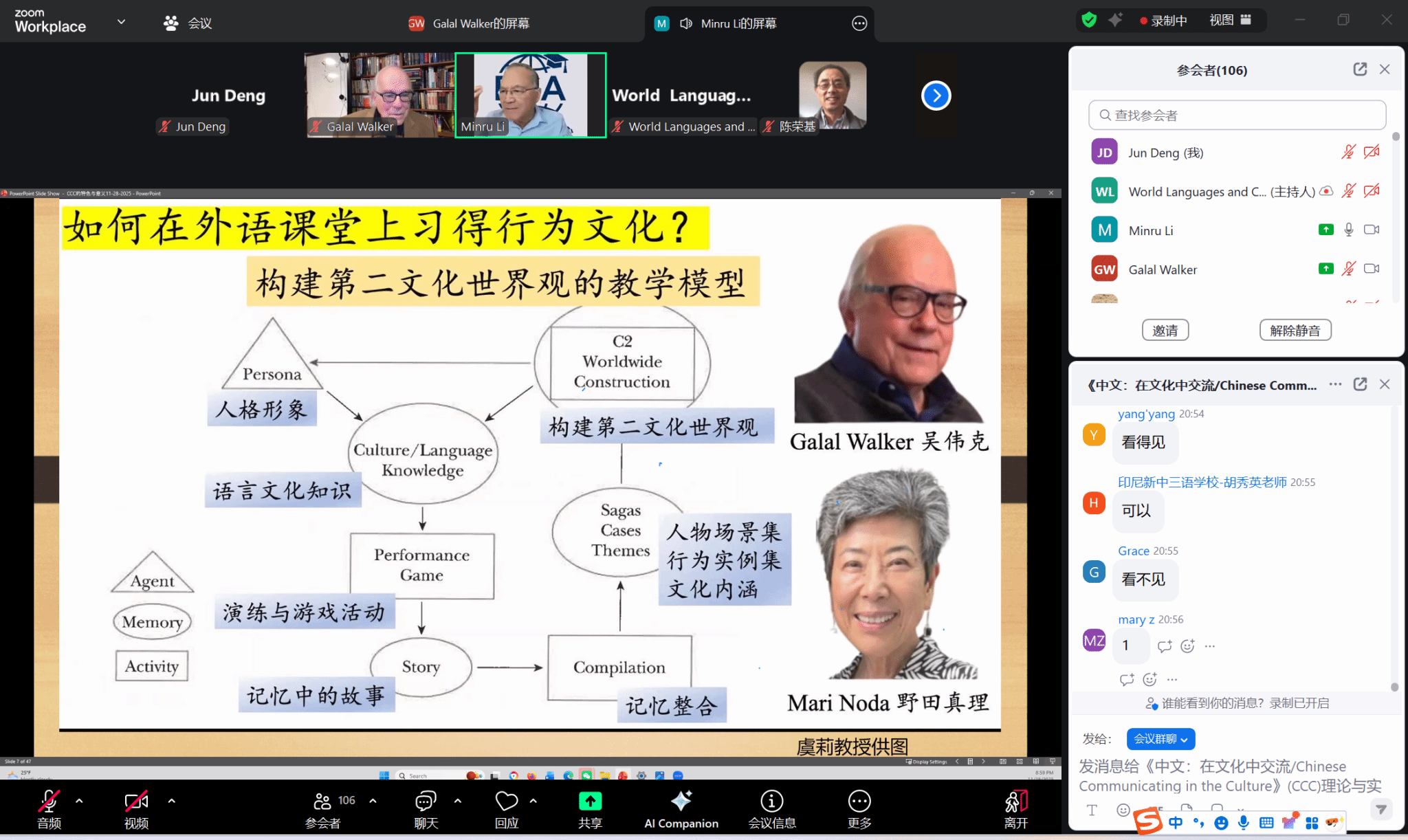 活动尾声,方环海对讲座进行点评,感谢两位权威专家的精彩分享。与会同仁在线上与两位教授展开热烈深入的交流互动。大家纷纷表示,本次活动不仅深化了自身对体演文化教学法代表性教材《中文:在文化中交流》的理解,更拓宽了对语言教学材料设计与第二语言教学法的认知视野,为今后国际中文课堂的课程规划与教学实践开辟了更丰富、更具操作性的路径。