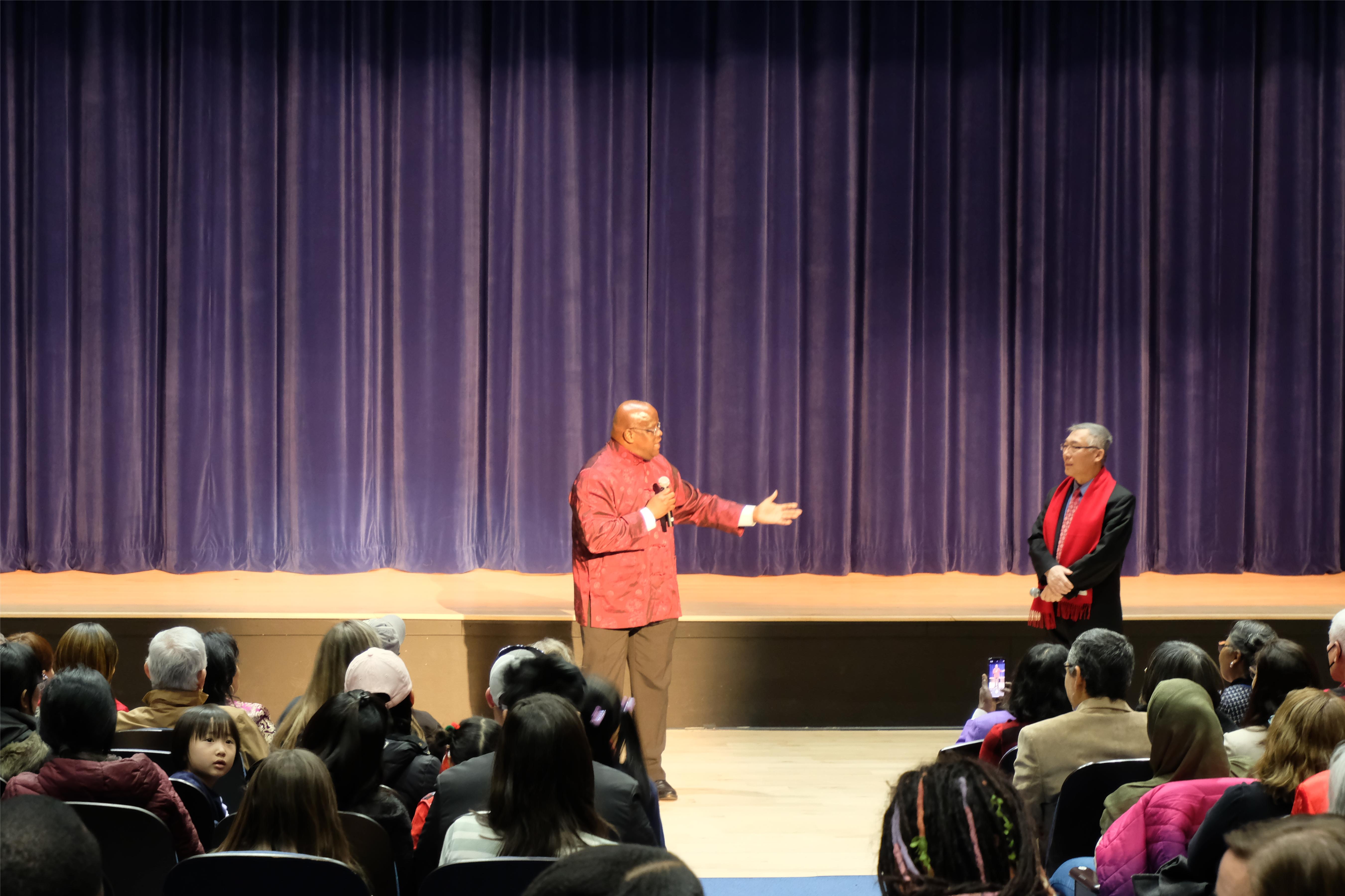 刘凤山副校长在开场前向现场观众致以新年问候,并讲述了中国的“龙”和“Dragon”之间的区别。安东尼·博伊尔(Antonio Boyle)对筹备此次晚会的工作人员表示感谢,他认为此次春节联欢晚会可以让更多人了解并体验到中国文化的魅力,增进不同文化间的交流与理解,促进校园和地区文化多样性。张翼博士表示这场演出不仅让家长们有机会直观地感受到孩子们在中文学习方面的进步,而且能进一步激发孩子们对中华文化的兴趣和热情。