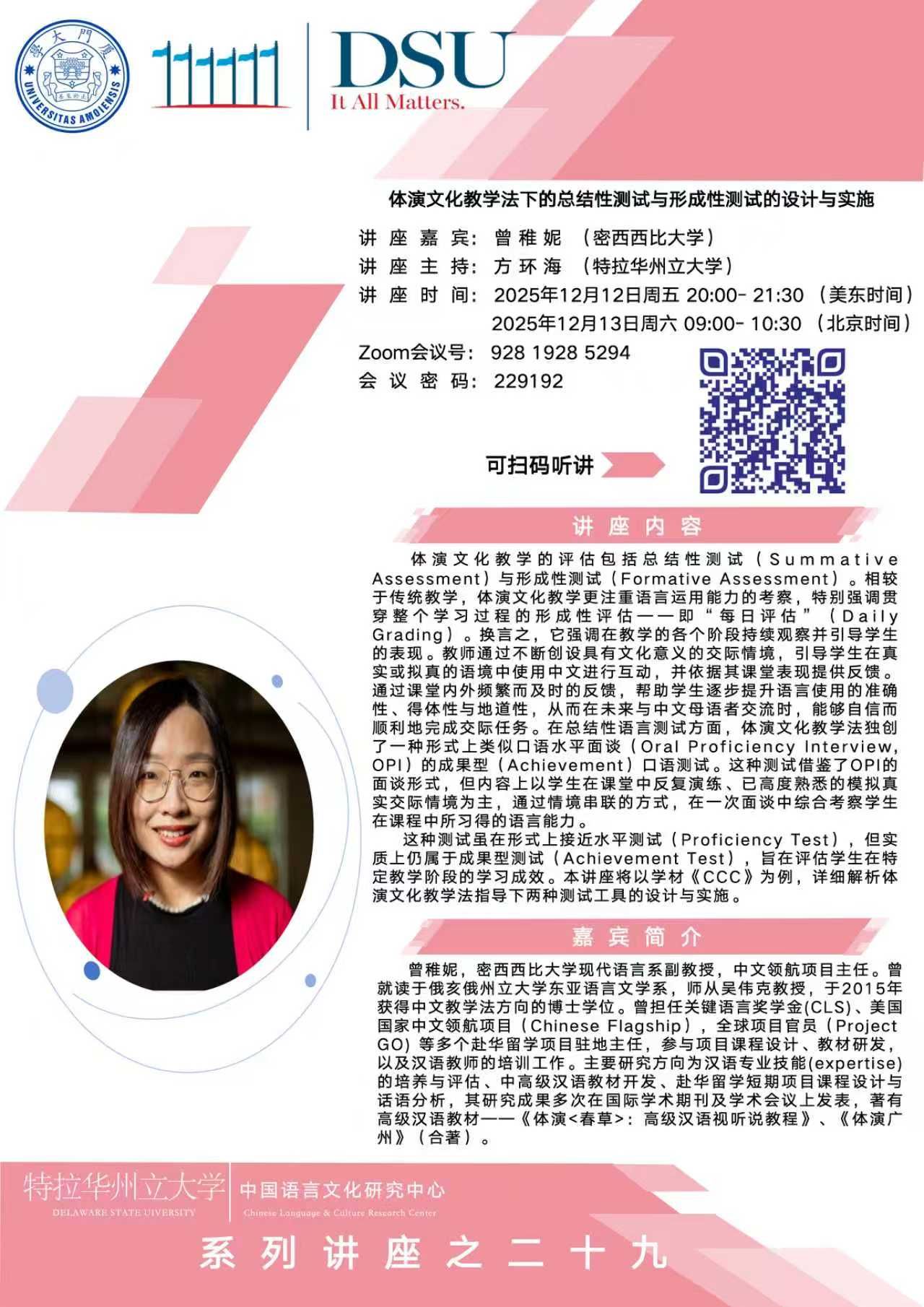 2025年12月12日,美国特拉华州立大学中国语言文化研究中心(以下简称“中心”)系列学术讲座第二十九期顺利举办。此次讲座由密西西比大学曾稚妮副教授主讲,讲座主题为《体演文化教学法下的总结性测试与形成性测试的设计与实施》。讲座采用线上形式举办,由中心主任方环海教授主持,众多来自世界各地的国际中文教育工作者线上参会。