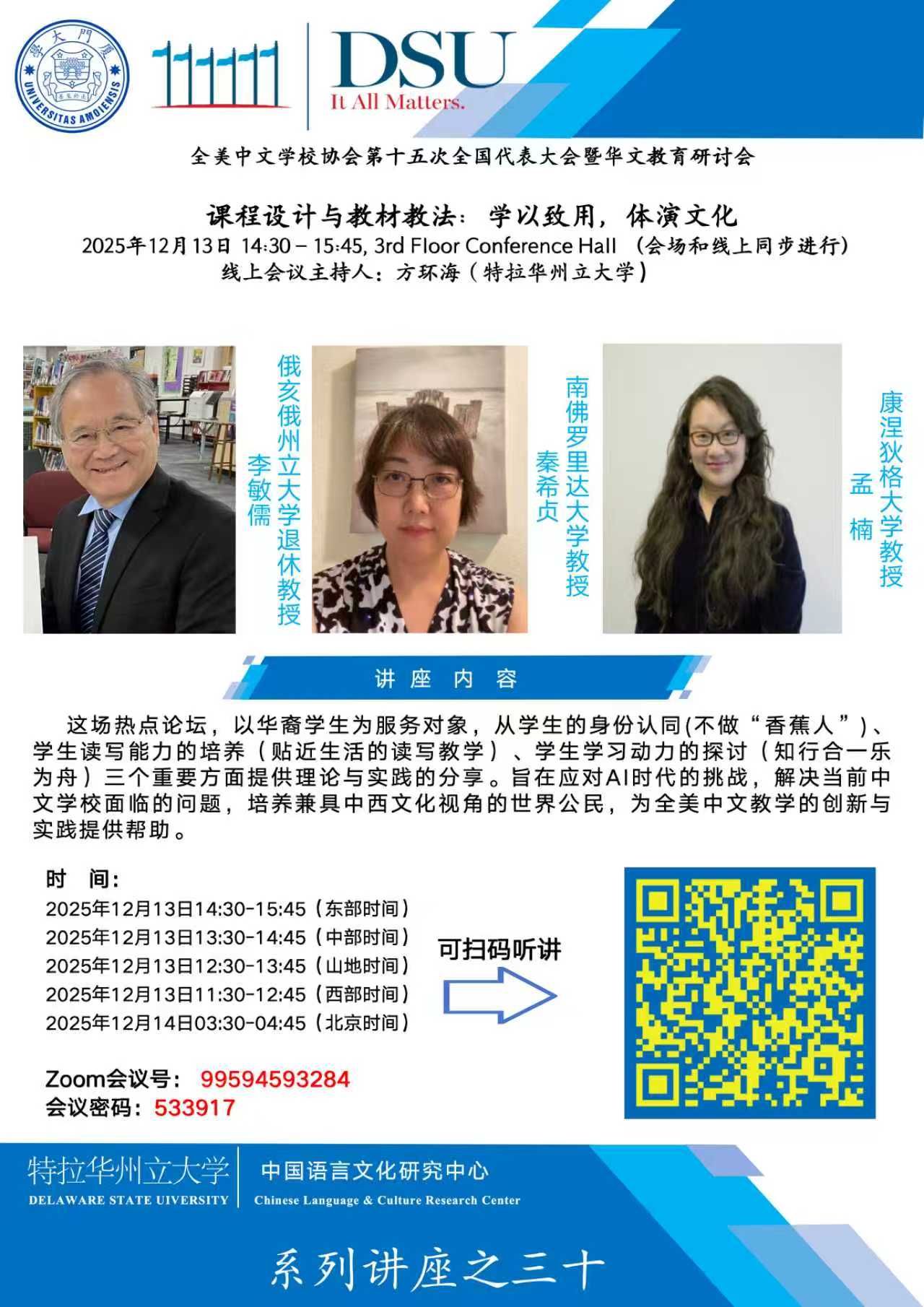 2025年12月13日,美国特拉华州立大学中国语言文化研究中心(以下简称“中心”)系列学术讲座第三十期顺利举办。此次讲座由俄亥俄州立大学李敏儒教授、南佛罗里达大学秦希贞副教授、康涅狄格大学孟楠副教授联袂主讲,讲座主题为《课程设计与教材教法:学以致用、体演文化》,由三个部分构成。讲座采用线上形式举办,由中心主任方环海教授主持。