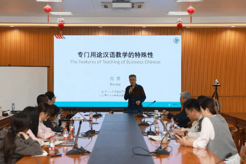 随后,张黎系统阐述了专门用途语言教学的语言观、语言学习观和语言教学观。他特别强调,专门用途语言教学的特点绝非仅仅是词汇选择上的不同。张黎以商务汉语中动词“做”的复杂搭配对象为例,生动展示了在专用语学习中通用语言成分使用的特殊性,并运用系统功能语言学理论,分析了企业话语的语篇结构及毗邻语对的话语特征。张黎还就专门用途汉语的教学内容与顺序、学习难点和教师配置等相关话题分享了观点。