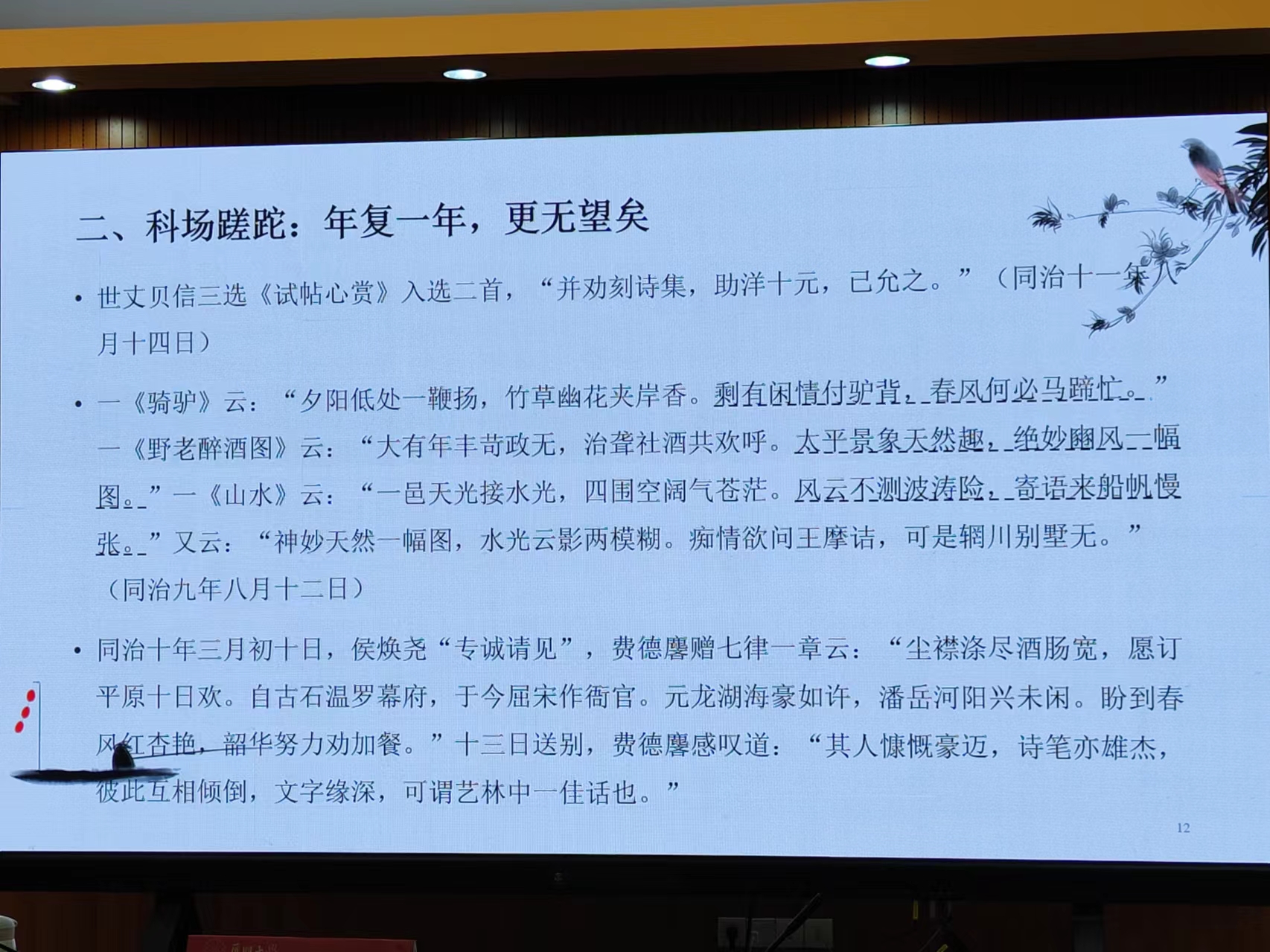 张鹤天首先介绍了费德麟的生平和家庭情况,他所作的《杏花春雨馆日记》记录了他从清同治九年(1870)至光绪十九年(1893)共二十四年的人生经历,日记多将笔墨着眼于其求仕之途和为官日常,是研究晚清学子生活状态的重要资料。费德麟多次参加科举却秋闱落榜,蹉跎多年,最终只能沉寂下僚,依靠捐官之举进入仕途,晚清科举的困难程度可见一斑。