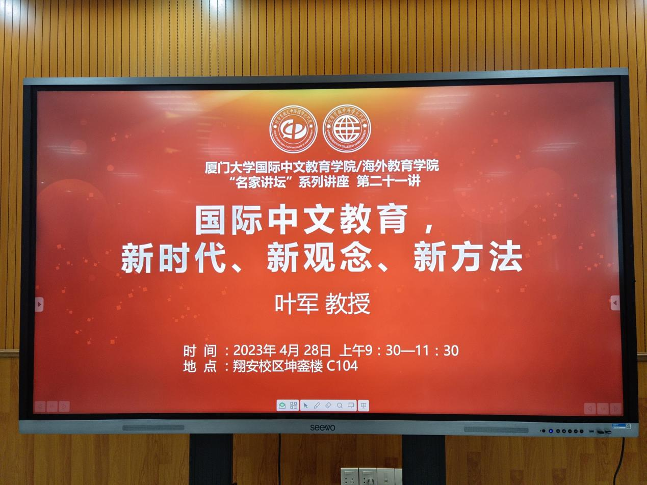 4月28日上午,厦门大学国际中文教育学院/海外教育学院名家讲坛系列讲座第二十一讲成功举办。华东师范大学国际汉语文化学院副院长,全国汉语国际教育专业学位研究生教育指导委员会委员,国家语委全球中文发展研究中心副主任叶军教授应邀于厦门大学翔安校区坤銮楼C104为学院师生做了题为“国际中文教育,新时代、新观念、新方法”的讲座。本次讲座由厦门大学国际中文教育学院/海外教育学院副院长耿虎教授主持,学院在校师生出席了讲座。
