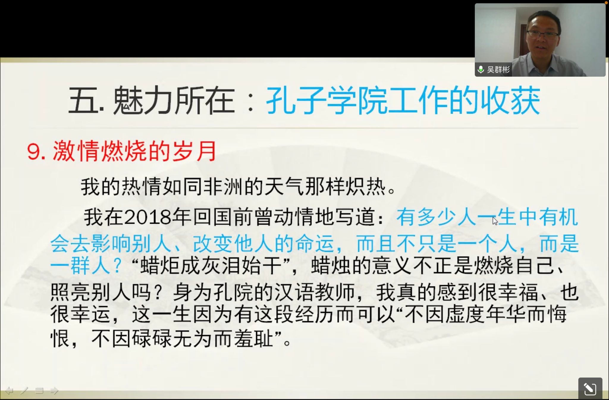最后,吴老师分享了他在孔子学院工作的收获。如提升了汉语教学能力、组织管理能力等综合能力,开阔了眼界,也收获了桃李满天下的成就感。