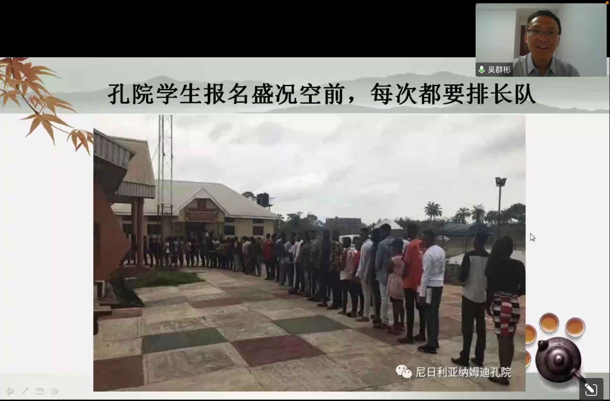 随后,吴老师介绍了纳姆迪·阿齐克韦大学孔子学院,并重点介绍了该孔子学院的办学成果。吴老师讲到,孔子学院是纳姆迪·阿齐克韦大学最受欢迎的学院,培养了许许多多精通汉语的尼日利亚人才,许多学生通过学习中文改变了命运,为构建中非命运共同体、共建“一带一路”搭起了“民心相通”的文化桥梁。