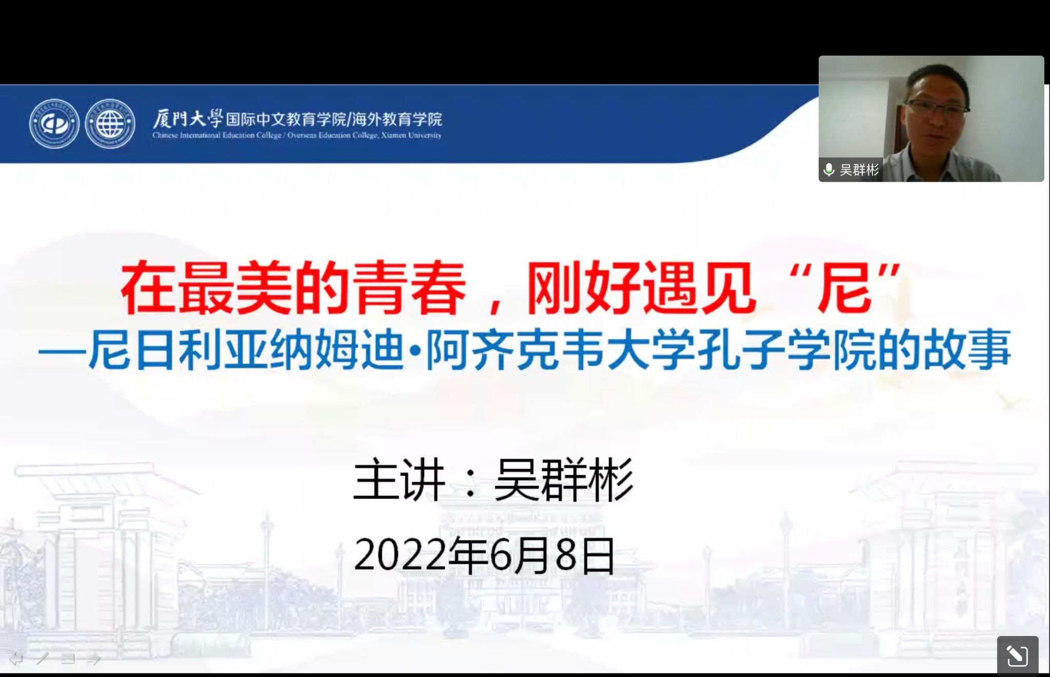 2022年6月8日晚,厦门大学国际中文教育学院/海外教育学院第二百四十九期学术沙龙借助腾讯会议线上平台举行。本期学术沙龙有幸邀请到厦门大学国际中文教育学院/海外教育学院中外语言合作交流中心的吴群彬老师,为大家分享他在尼日利亚纳姆迪·阿齐克韦大学孔子学院的故事。