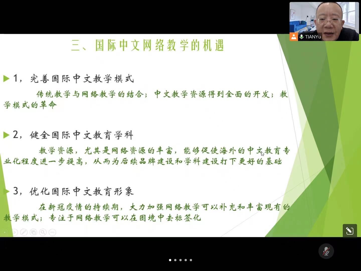 接着,田老师从教材及设备、网络教学法、习得与测试三个角度分析了当前国际中文网络教学面临的挑战。从完善中文教学模式、健全国际中文教育学科、优化国际中文教育形象三个角度剖析了国际中文网络教学的机遇。
