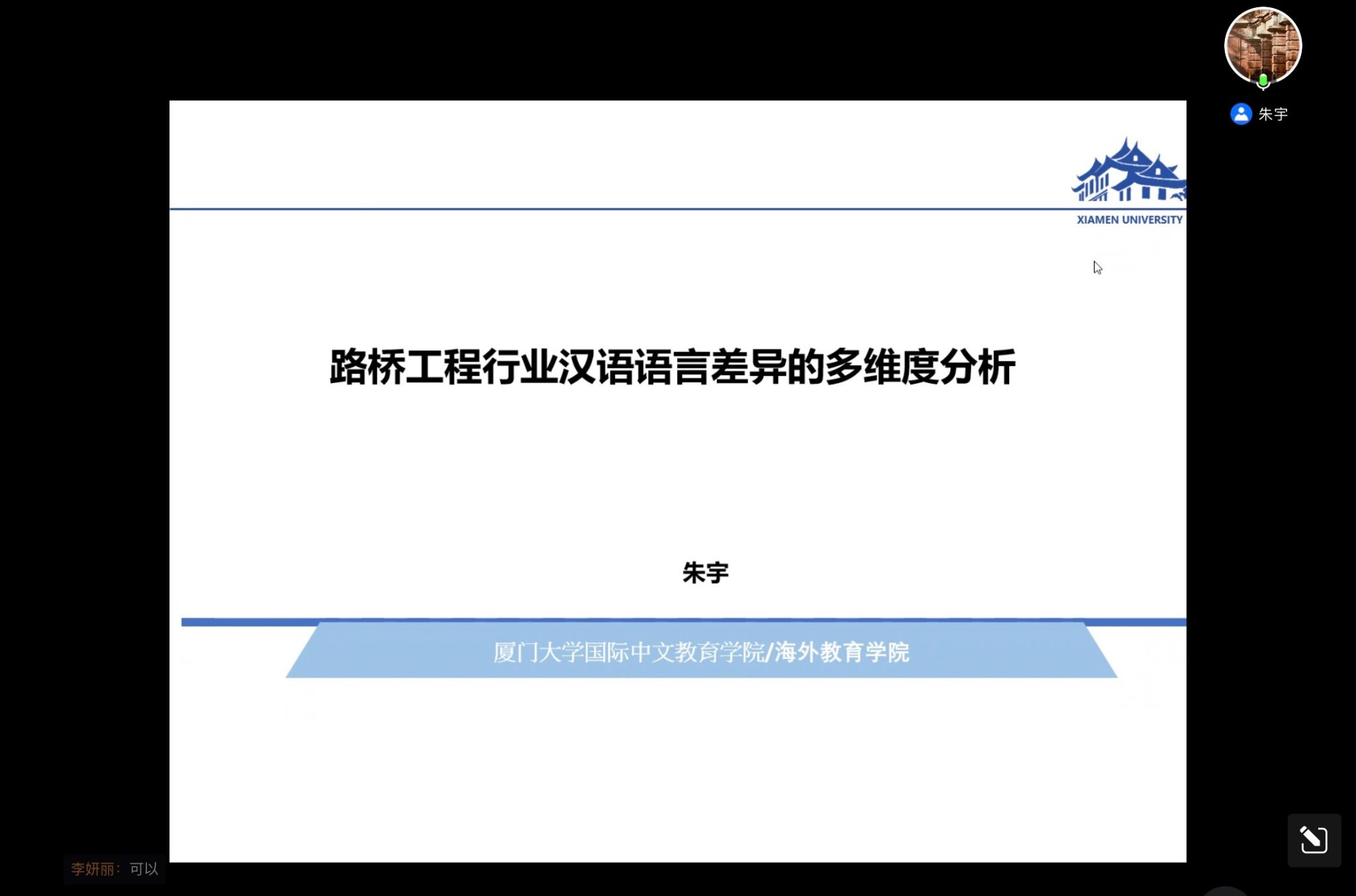 2022年4月13日晚,厦门大学国际中文教育学院/海外教育学院第二百四十五期学术沙龙借助腾讯会议线上平台举行。本期,学术沙龙有幸邀请到国际中文教育学院/海外教育学院朱宇教授,为大家带来了一场题为《路桥工程行业汉语语言差异的多维度分析》的专题讲座。