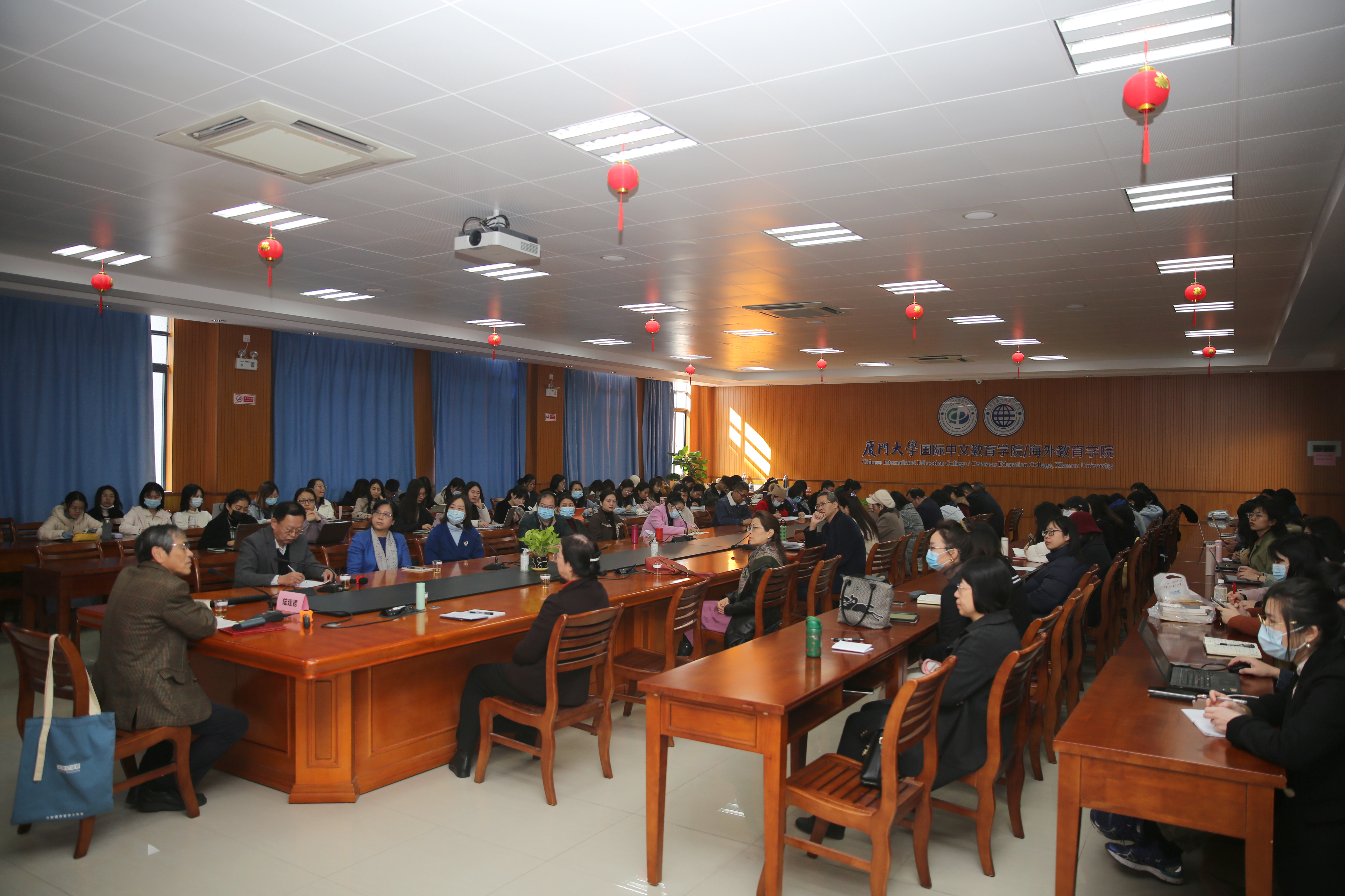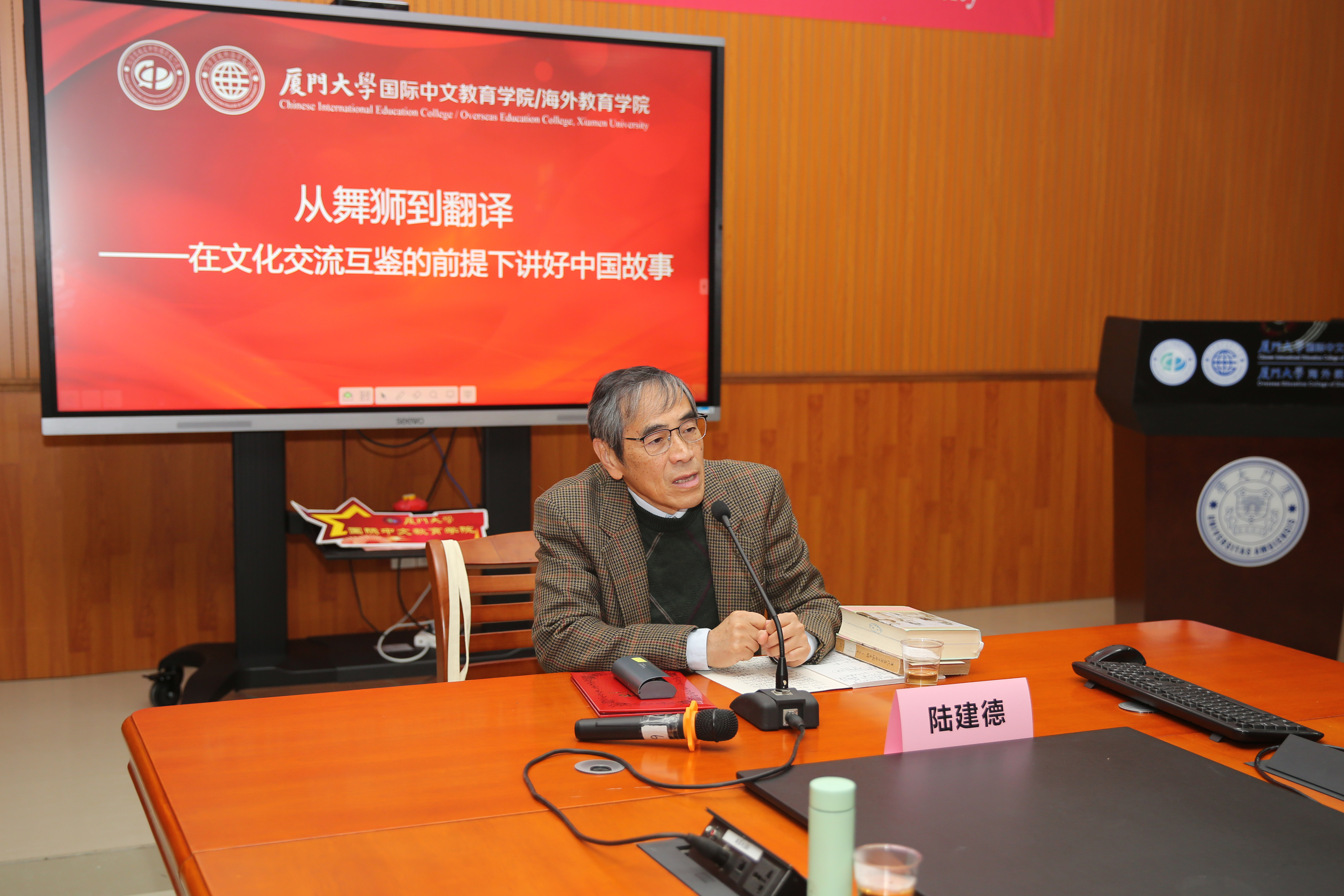 12月31日上午,厦门大学国际中文教育学院/海外教育学院名家讲坛系列讲座第十五讲成功举办。厦门大学比较文学与跨文化研究中心主任、外文学院讲座教授陆建德教授应邀在坤銮楼C104会议室为学院师生做了题为“从舞龙到翻译——在文化交流互鉴的前提下讲好中国故事”的讲座。本次讲座由我院副院长耿虎教授主持,学院党委书记范丽、院长陈志伟、厦门翻译协会会长韦忠和校友以及全院师生近百人出席了讲座。