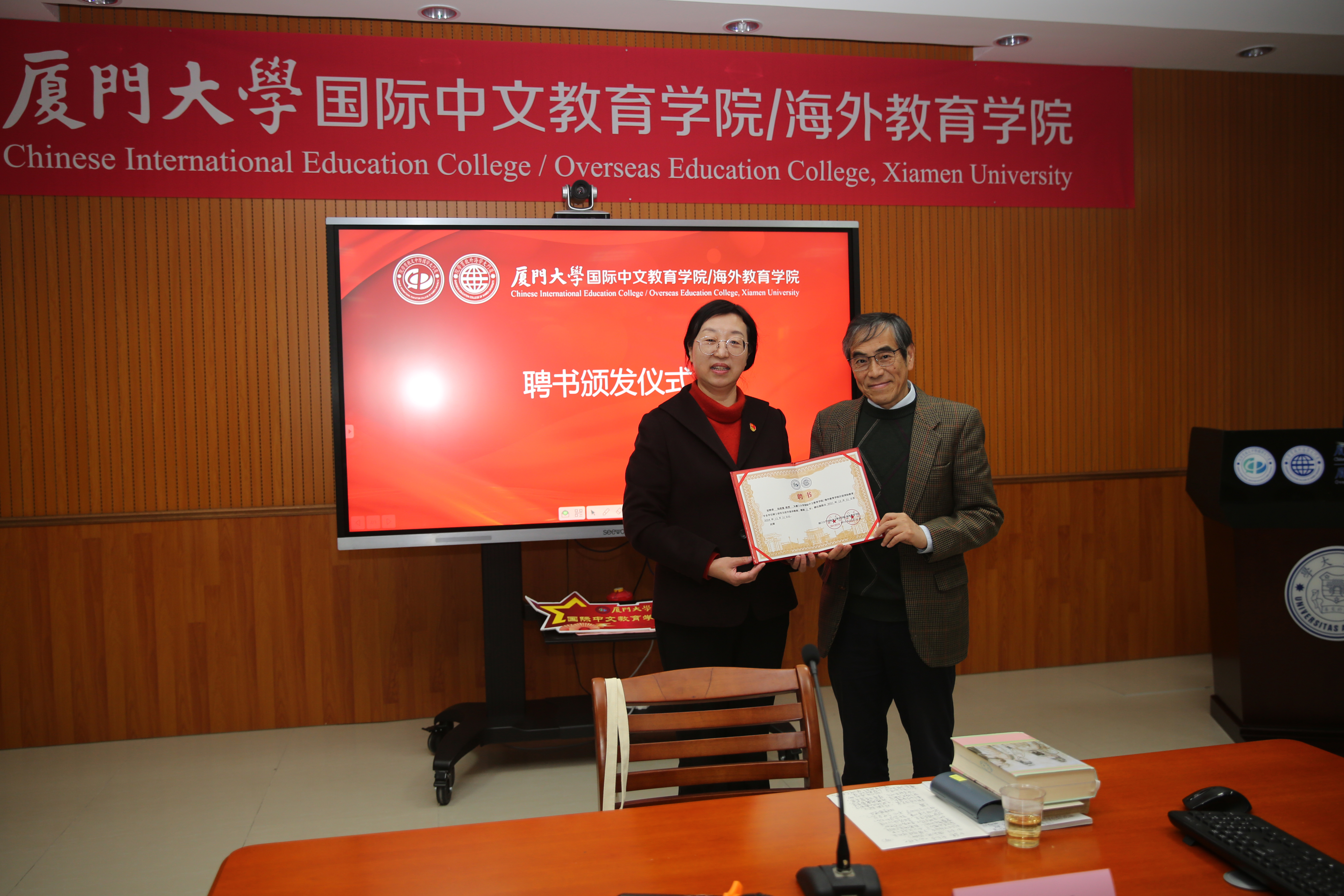本次名家讲坛共两项议程。首先,学院党委书记范丽为陆建德教授颁发了聘书,敦聘陆建德教授为国际中文教育学院/海外教育学院研究生校外指导教师。陆建德教授为中华文化推广与传播做出了极大的贡献,在跨文化交流与文化传播方面有着丰富的研究经验。陆教授的指导将为我院学科建设、导师队伍建设 以及研究生人才培养等方面带来极大的帮助。