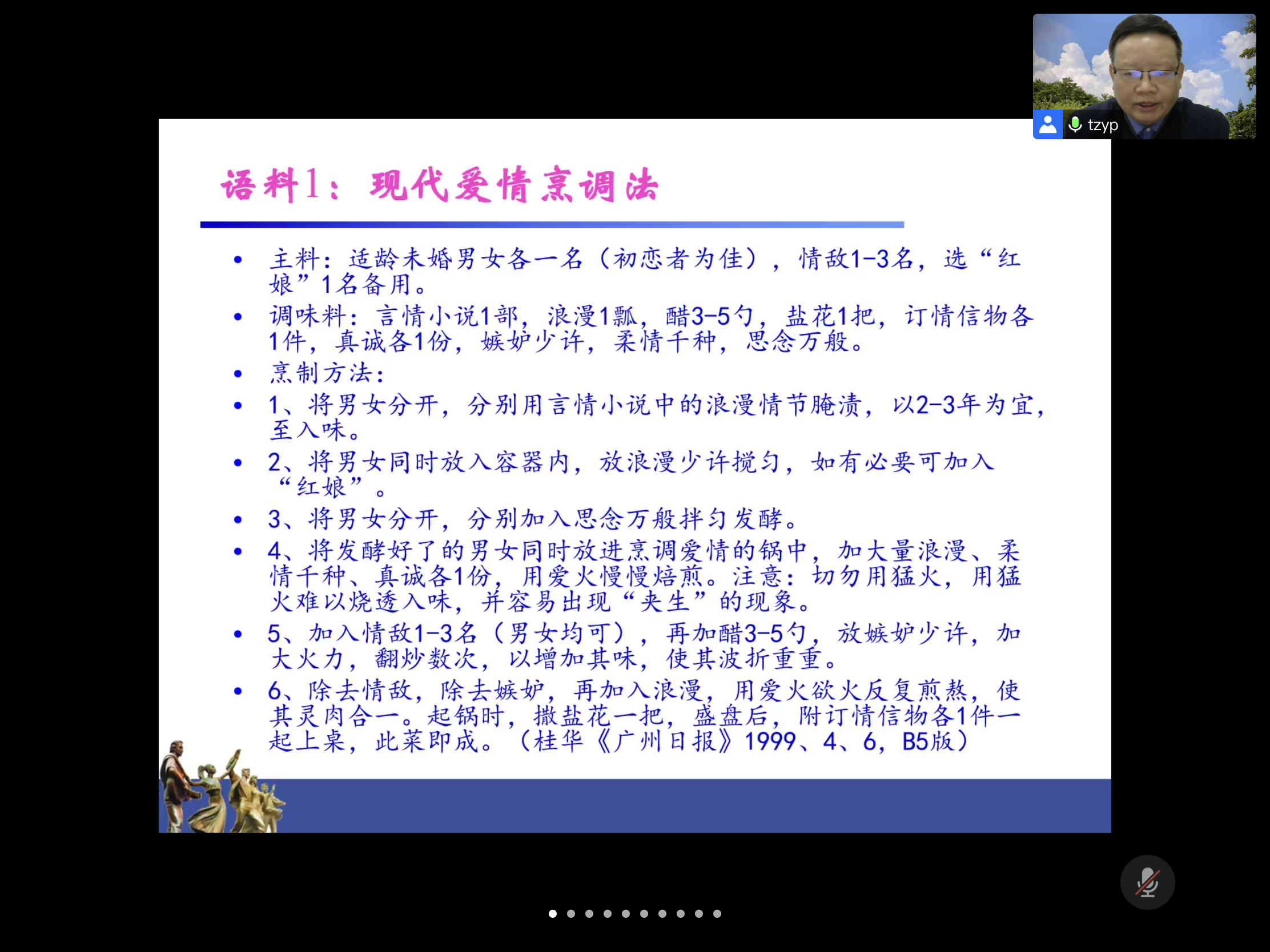 讲座伊始,曾教授开门见山地指出当前留学生作文中存在语法正确、读起来不得体的问题,并就语体、语境进行了进一步论述。语境分为具体语境与类型化语境,具体语境又分为正式语境与非正式语境,语体则是类型化语境下的一个分支,这就要求修辞要符合具体语境要求,如此才能说话得体适宜。例如日常谈话中说的“眼珠子”在文学艺术中一般表述为“眸子”。曾教授还引用了名为“现代爱情烹调法”的一段语料,生动形象地展现了语言艺术的绝妙。