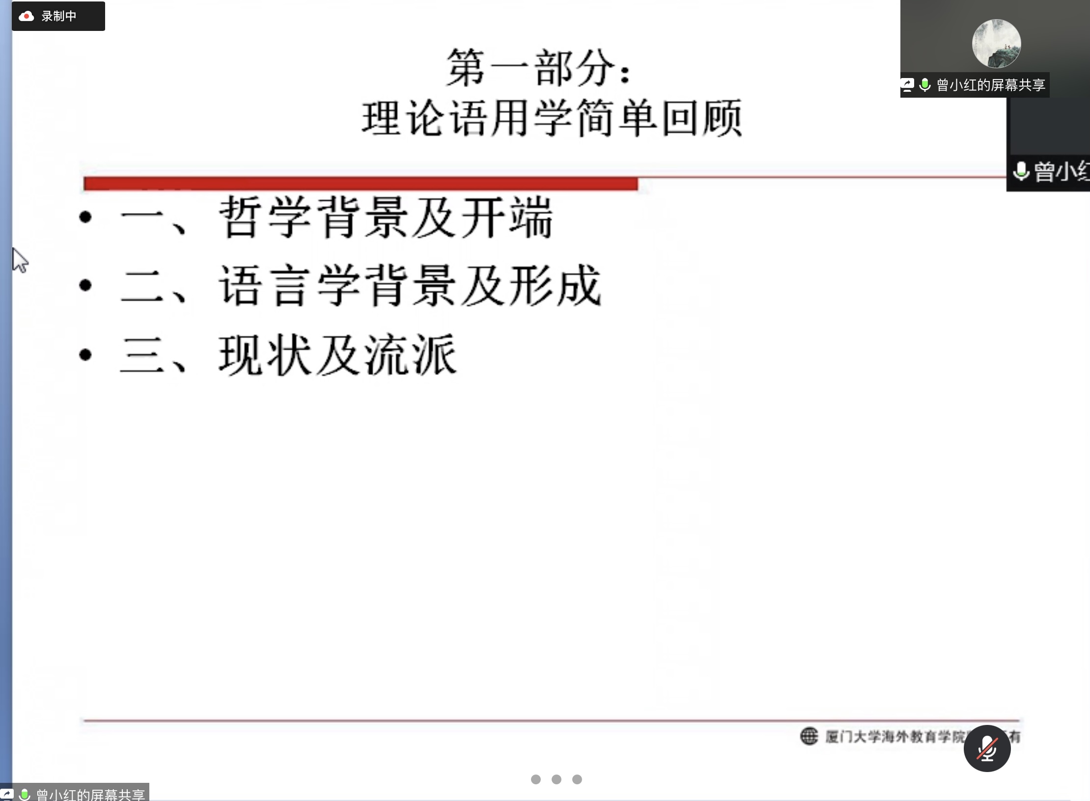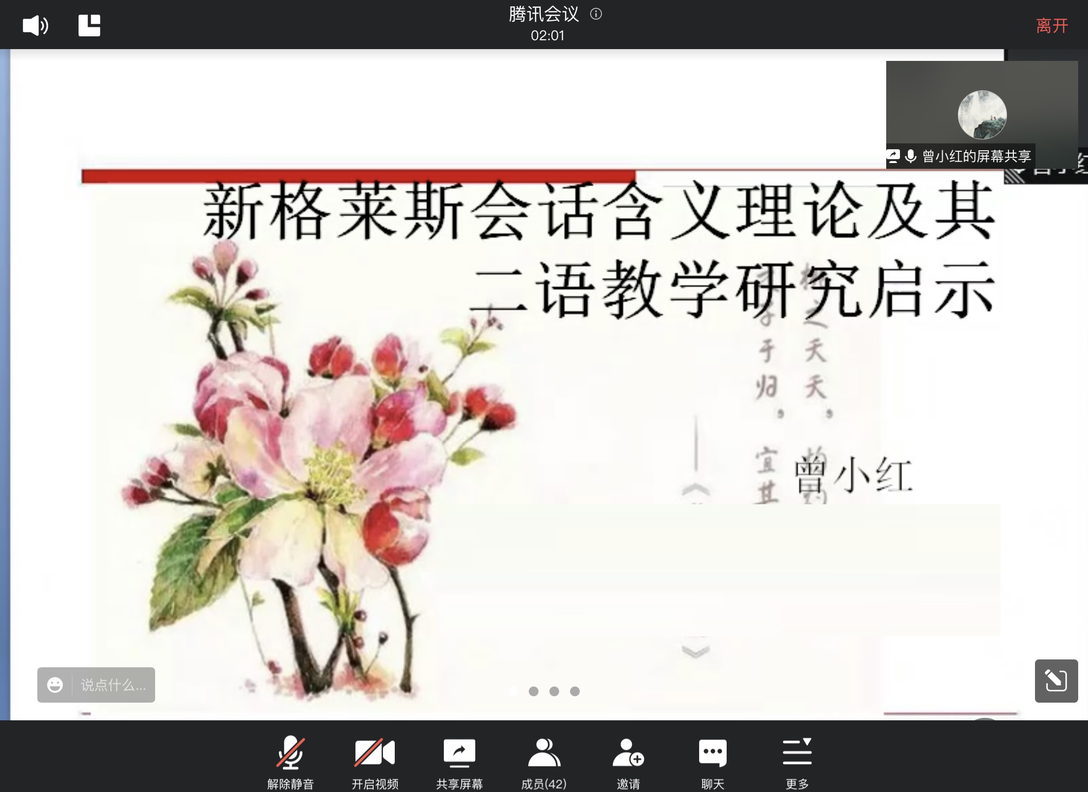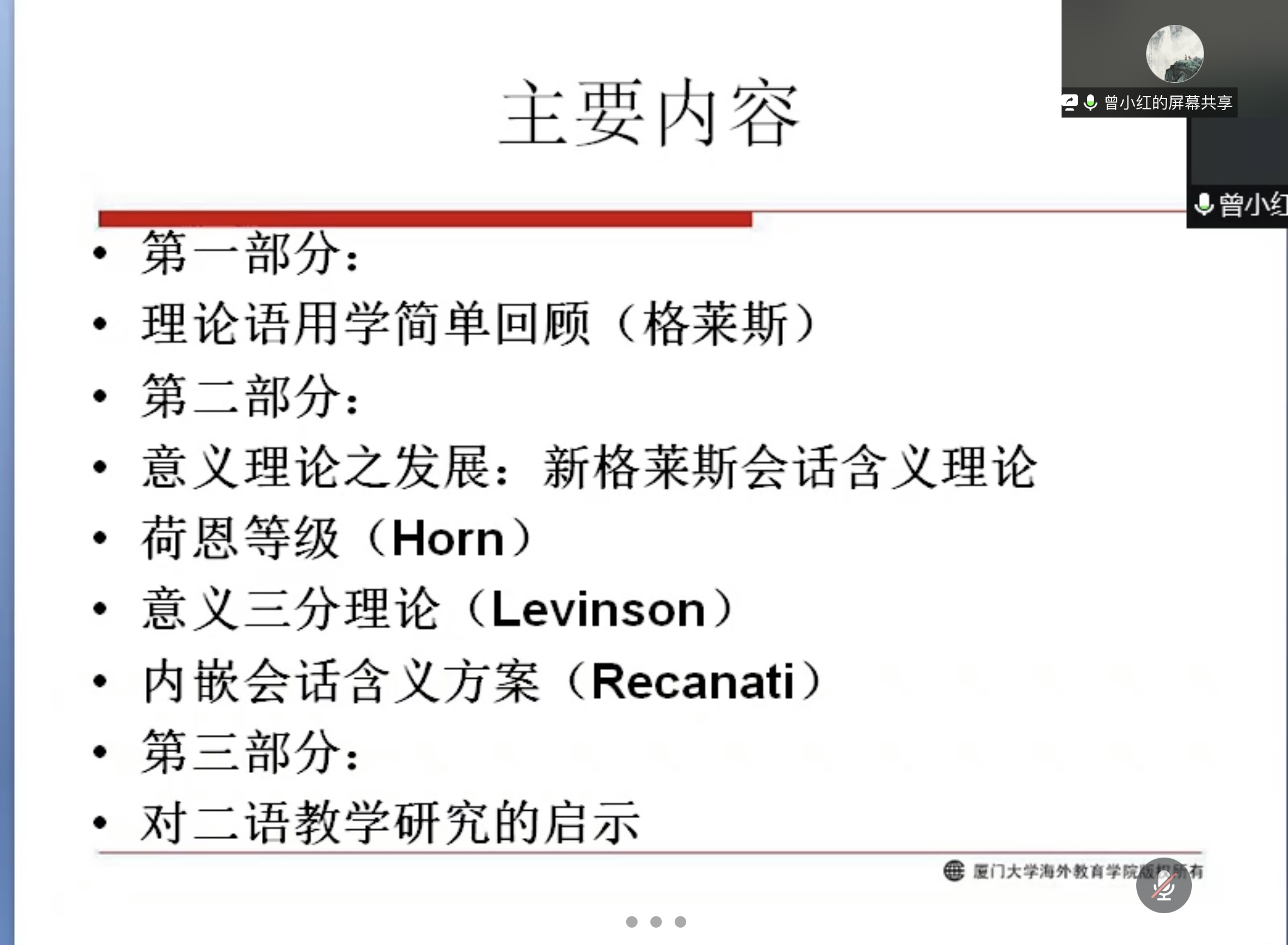 2021年12月1日晚,厦门大学国际中文教育学院/海外教育学院第二百四十期学术沙龙借助腾讯会议线上平台举行。本期,学术沙龙有幸邀请到曾小红副教授,为大家讲解《新格莱斯会话含义理论及其二语教学研究启示》。