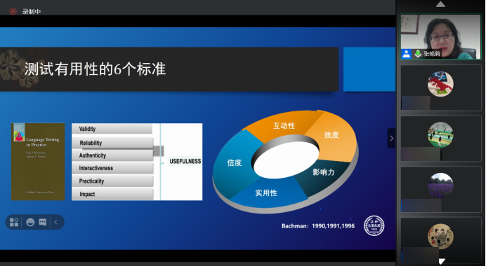 张艳莉教授首先介绍了语言测试的两个基本功能和语言测试的不同类型,阐述了测试有用性的六个标准:效度、信度、实用性、互动型、影响力、真实性,对测评发展的四个发展阶段进行梳理,并总结了语言测评的发展趋势:从语言要素来说,从分立式知识发展到综合性语言知识、再发展到语言交际能力;从内涵与外延来说,从语法能力、语篇、语用等发展到任务式测试。张教授介绍了目前影响最大、最完善的语言测试模式,即Bachman的交际语言能力模式,该模式也是HSK考试的理论依据。
