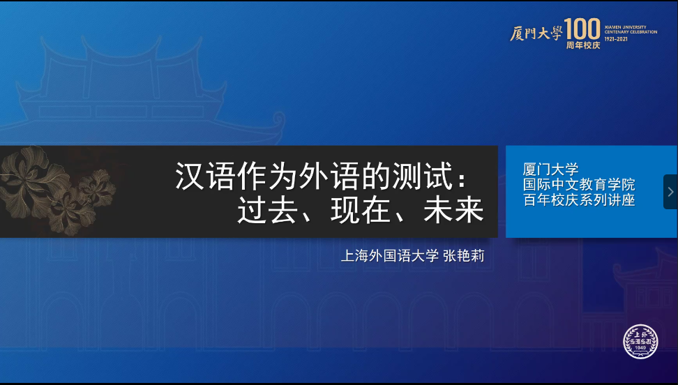5月19日晚,厦门大学国际中文教育学院/海外教育学院百年校庆系列讲座第八讲在“腾讯会议”线上平台开讲,上海外国语大学国际文化交流学院院长张艳莉教授为大家带来《汉语作为外语的测试:过去、现在、未来》的专题讲座。本期讲座由朱宇教授主持,参会师生达一百二十余人。