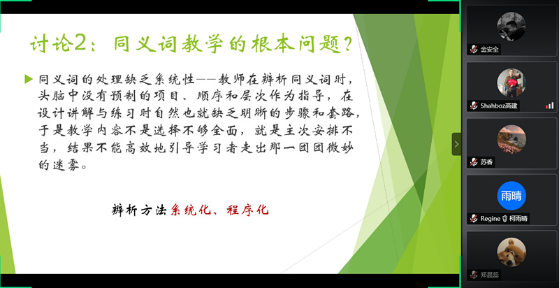 10月21日晚,第219期学术沙龙在海外教育学院A104成功举办。由于还有部分国际学生尚未返校,所以本次沙龙借助“腾讯会议”这一手段,线上线下同步进行。这次沙龙我们邀请到的主讲人是华文系吴琳讲师,主讲内容为对外汉语词汇教学,且主要针对汉语作为二语言教学中的同义词教学,讲座围绕“系统化、程序化的同义词教学展开”。