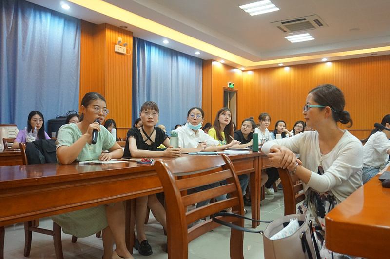 讲座伊始,吴琳老师分别针对学习和教学两个方面给同学们提出了两个问题供大家思考。第一个问题是,汉语的学习难点是什么?同学们畅所欲言,总结下来主要包括学习汉字、汉语声调、汉语语法、汉语词汇这几个方面。其中有同学特别提到汉语一词多义现象和同义词数量多这一问题给留学生学习汉语带来了很大的困难。