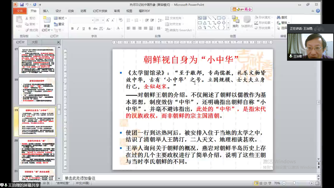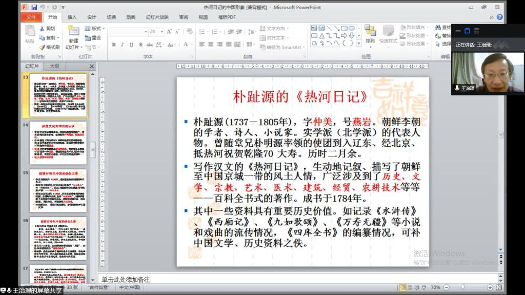 首先,王老师从汉字文化圈的重要国家朝鲜入手,讲述朝鲜半岛的历史发展与中国历代的渊源。《燕行录》作为朝鲜汉学家认识中国的第一手资料,内容十分广泛。其中,朴趾源用汉文著述的《热河日记》作为一部展现中国风土人情和文化图景的百科全书式著作,成为后代研究中国清代社会历史的宝贵资料,在很大程度上弥补了中国史料的空缺。