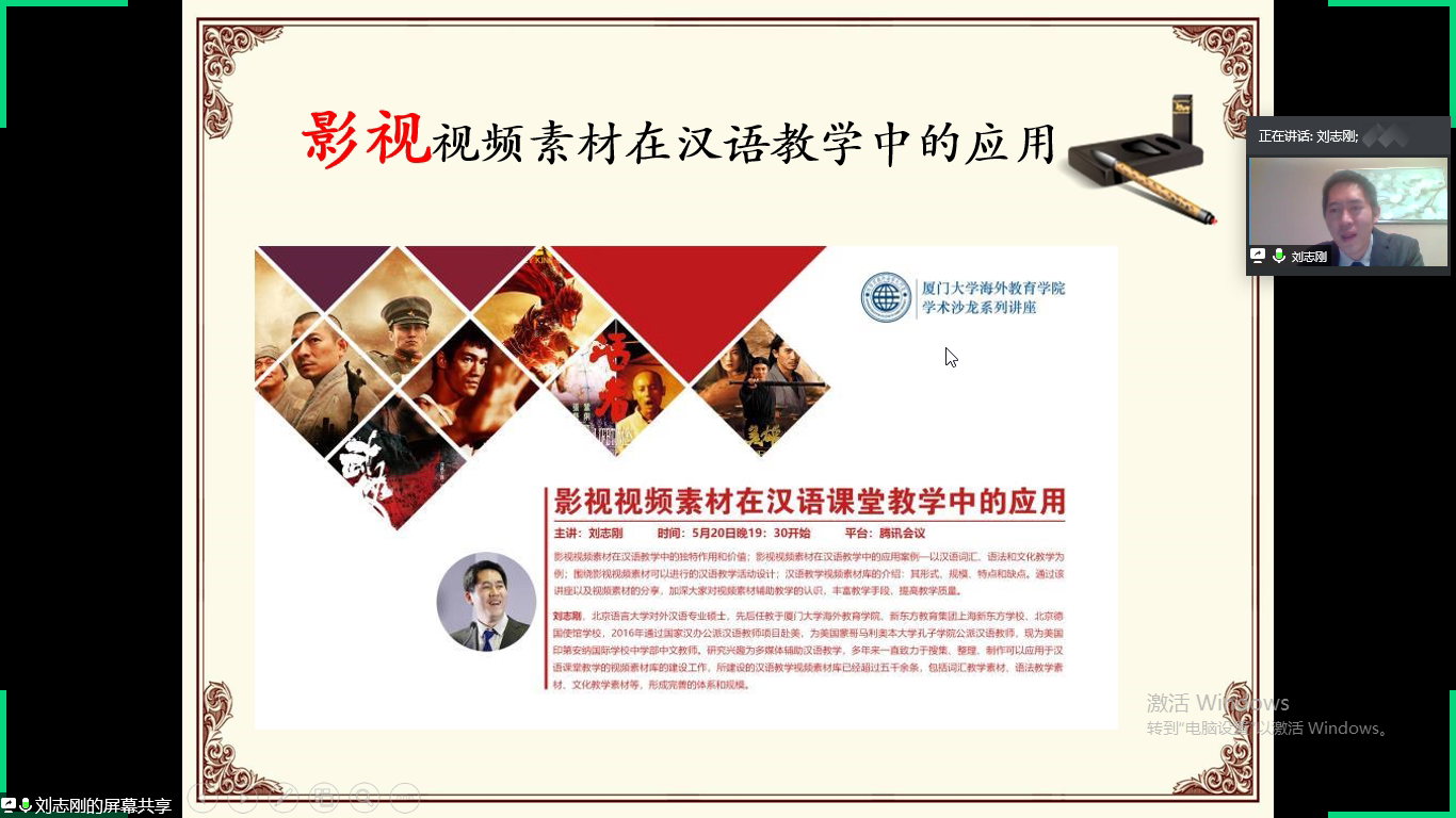 5月20日晚7点30分,第211期学术沙龙在“云端”成功举办。北京语言大学硕士、美国印第安纳国际学校中学部中文教师刘志刚老师应邀作“影视视频素材在汉语课堂教学中的应用”主题讲座。本次讲座由海外教育学院潘超青教授主持,学院教师、研究生及留学生共九十余人聆听了此次讲座。
