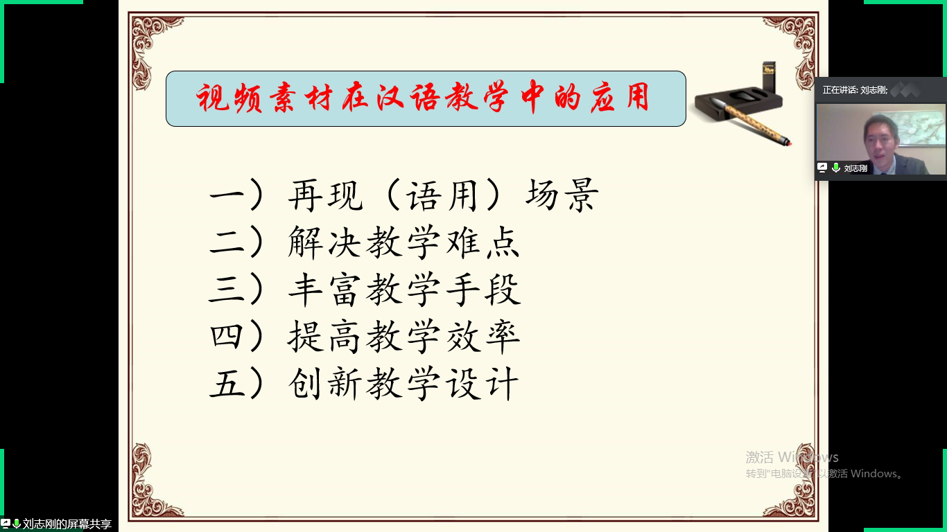 讲座围绕“视频素材的三大特点”、“视频素材在汉语教学中的应用”、“视频素材存在的问题”三个部分展开。刘老师首先提出视频素材具备三大特点,一是真实性和趣味性,二是形象性和直观性,三是多维一体性。他通过展示多个视频片段,说明视频素材的这三大特点决定了其在教学中的价值。之后,刘老师详细介绍了视频素材在汉语词汇教学、语法教学、文化教学、听力口语教学及视听说课上的使用,利用实例讲解说明视频素材具有再现语用场景、解决教学难点、丰富教学手段、提高教学效率、创新教学设计等五个作用。最后,他指出视频素材在教学中存在一些问题,他认为要选用语境清晰、台词简明、意义明朗的视频素材辅助教学,并且要注意避免因个别字词与学生母语中负面词汇发音相似而造成的文化冲突和误会。