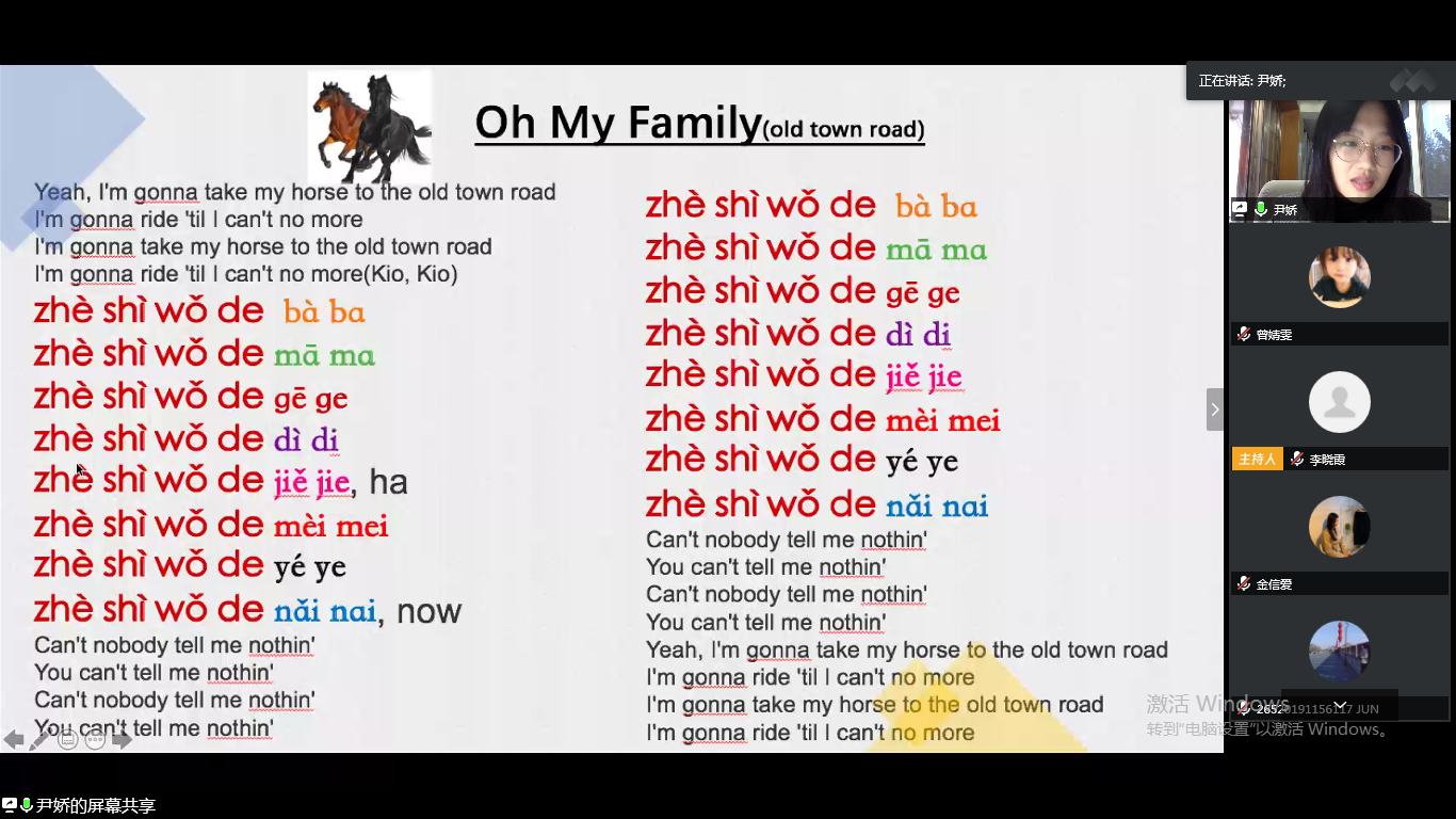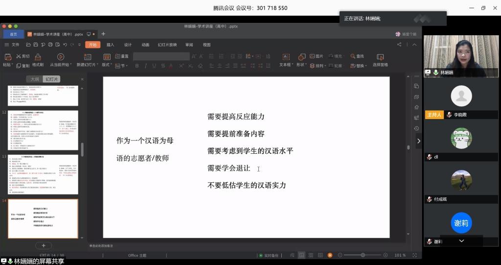 林丽丽同学为大家分享了几种课堂游戏,包括词汇、汉字、句子短文等方面的小游戏,帮大家更好开展教学。她也提到我们应该培养跨文化意识、注意学生学习特点、树立版权意识,还要学会独处、享受生活。