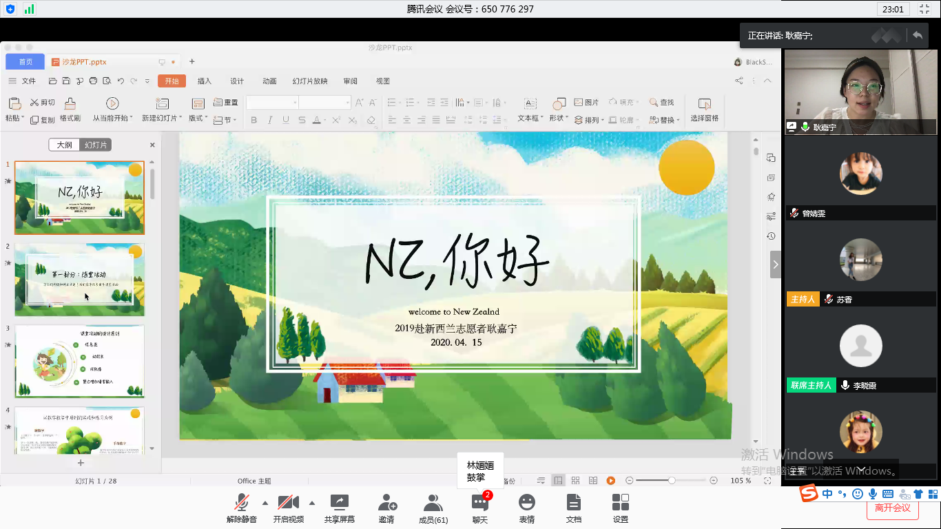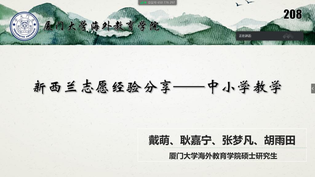 受新冠肺炎疫情影响,本学期第一场学术沙龙讲座借助“腾讯会议”软件,于4月15日晚以网络会议的特殊形式展开。这次讲座邀请了四位从新西兰归国的汉语教师志愿者,内容围绕中小学教学展开。