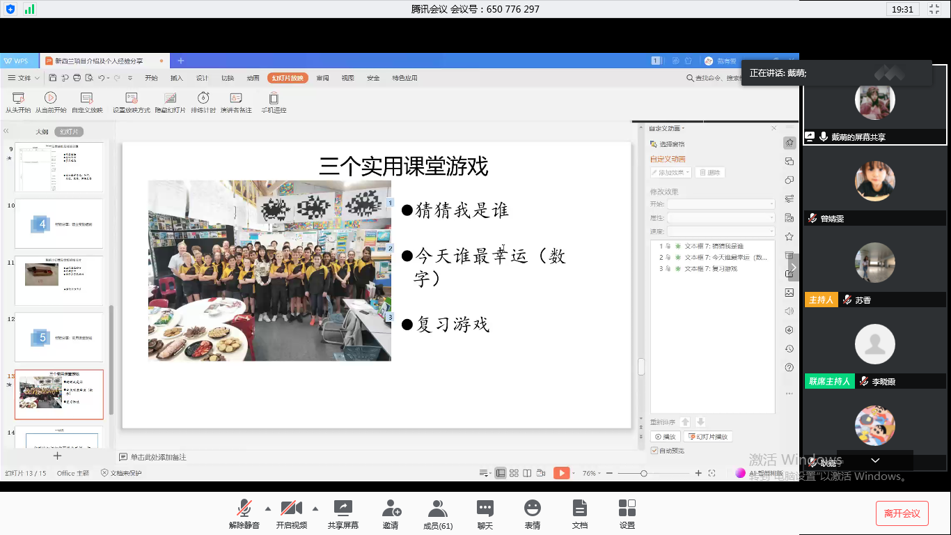 戴萌同学首先介绍了新西兰志愿者项目,分享了一些关于面试和培训的小知识。接着,她强调汉语教师要做好心理建设,勤写教学反思,建立奖励措施。她还介绍了“猜猜我是谁”,“今天谁最幸运”等三个实用的课堂活动。